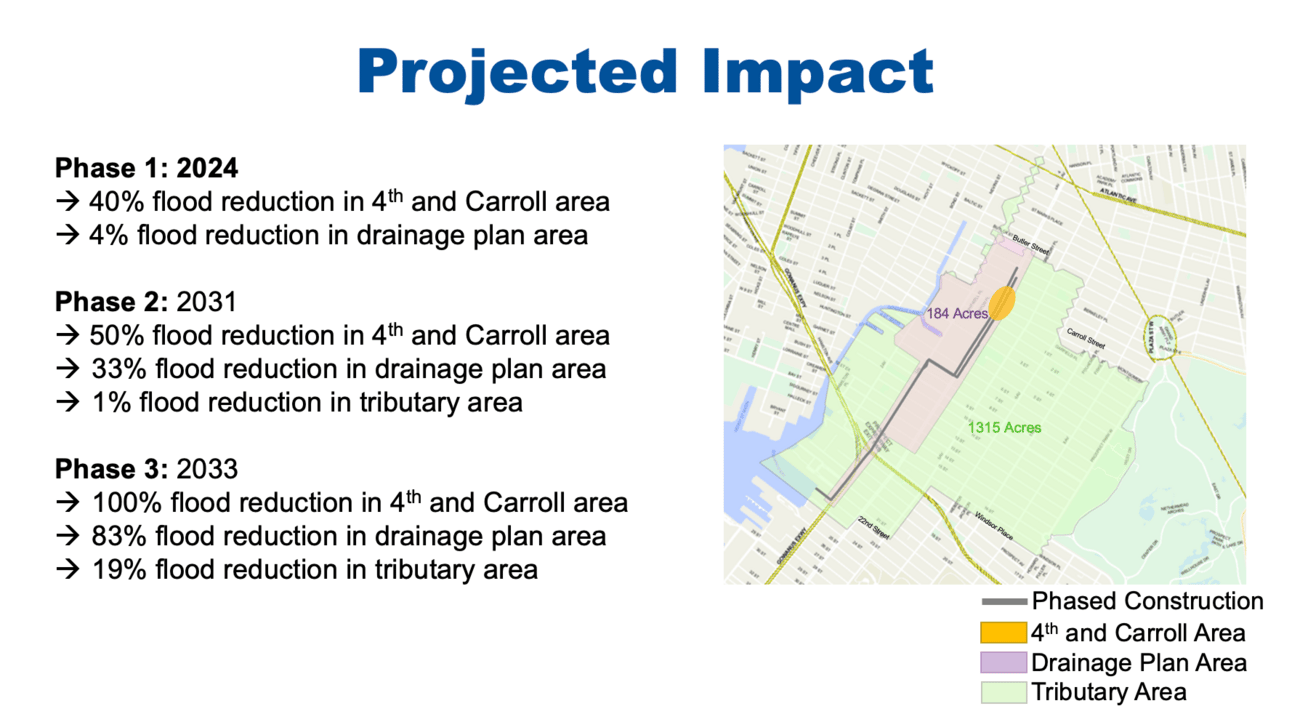 More specifically, the DEP estimates that flood reduction in the 4th Ave / Carroll St area (orange area in map below) will get to 40% of what is needed by 2024, and then….9 years later…it will handle 100% of our new water reality.