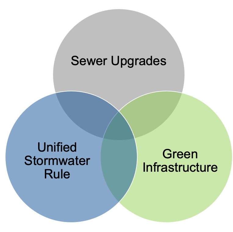In addition to CSO facilities and green infrastructure, building owners need to direct their stormwater runoff AWAY from the sewers, which is why the city passed the new Unified Stormwater Rules (see Where To Point Your Gutters). This is a massive evolution which will happen over time in almost every building in the city, but will take many years.